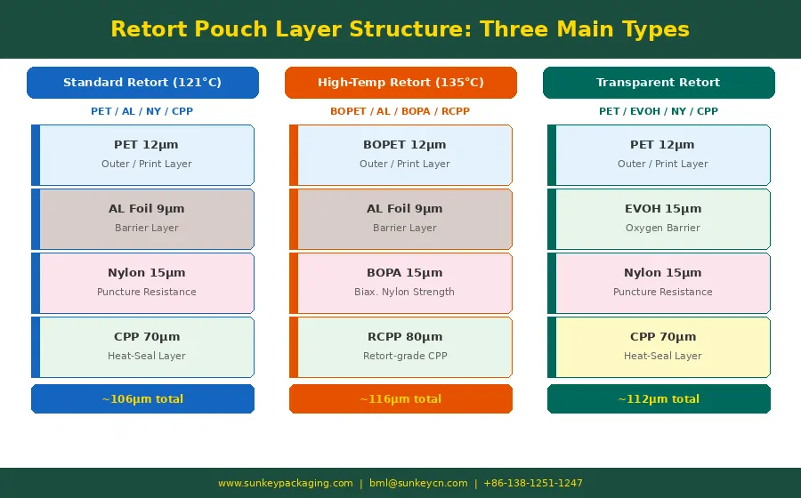 Нет. Структура, предназначенная для 121°C, откажет при 135°C. Критическое отличие — во внутреннем слое CPP: стандартный CPP размягчается при 135°C и теряет целостность шва. Для 135°C необходимо использовать RCPP. Кроме того, наружный слой следует повысить с PET до BOPET, а средний — с NY до BOPA.