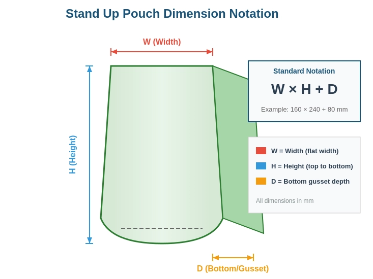 The standard notation for stand up pouch dimensions is W × H + D where each letter represents a specific measurement: