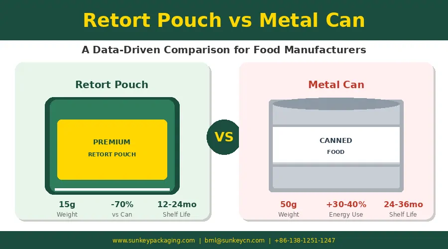 The following comparison evaluates retort pouches and metal cans across the seven dimensions that matter most to food manufacturers: