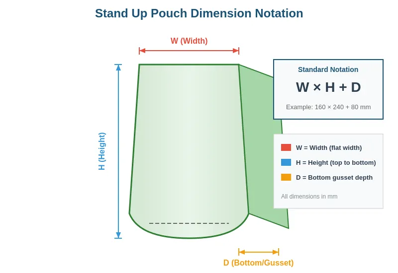 Быстрый ответ: Размеры пакетов-стойки выражаются как Ш × В + Г (ширина × высота + глубина нижней складки) в миллиметрах. Обычные размеры варьируются от 100×150+60 мм (50 мл) до 280×400+120 мм (3 кг). Для оптимального внешнего вида и стабильности заполняйте пакеты на 70–80 %. В случае сомнений запросите образцы, прежде чем совершать крупный заказ.